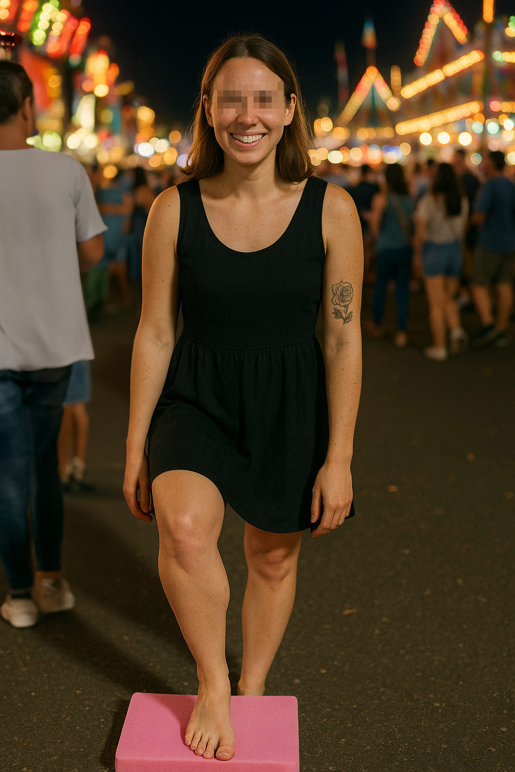 Sie hieß Elvira, war 26 Jahre alt und hatte gerade eine Runde Autoscooter hinter sich, als ihr eine Socke zu eng wurde. Nur für uns ganz unbefangen streifte sie sie ab und setzte sich auf den Boden. Sie zog das Bein an und hielt uns den nackten Fuß hin, um zu zeigen, wie befreiend sich das anfühlte.